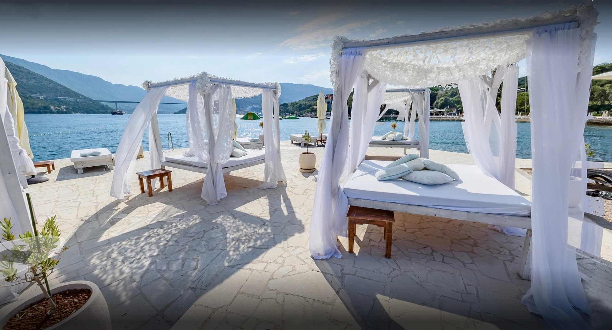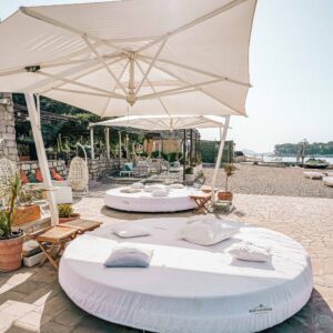 Visitors can reserve a range of sunbeds and loungers, from standard deck chairs with parasols to luxurious baldachin and round beds — ideal for couples or groups seeking extra comfort. With attentive beachside service, a modern restaurant and cocktail bar Copacabana Beach is perfect for a relaxing day by the Adriatic.