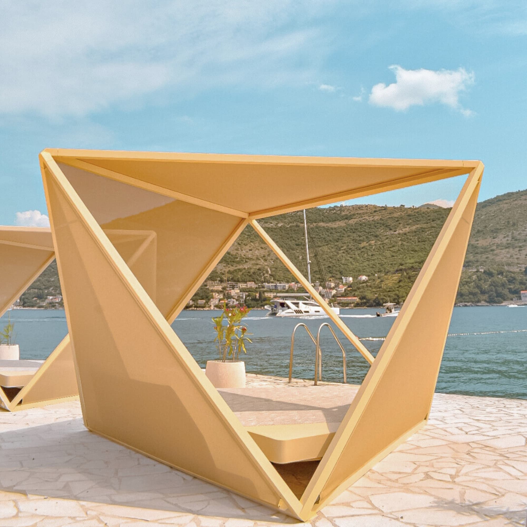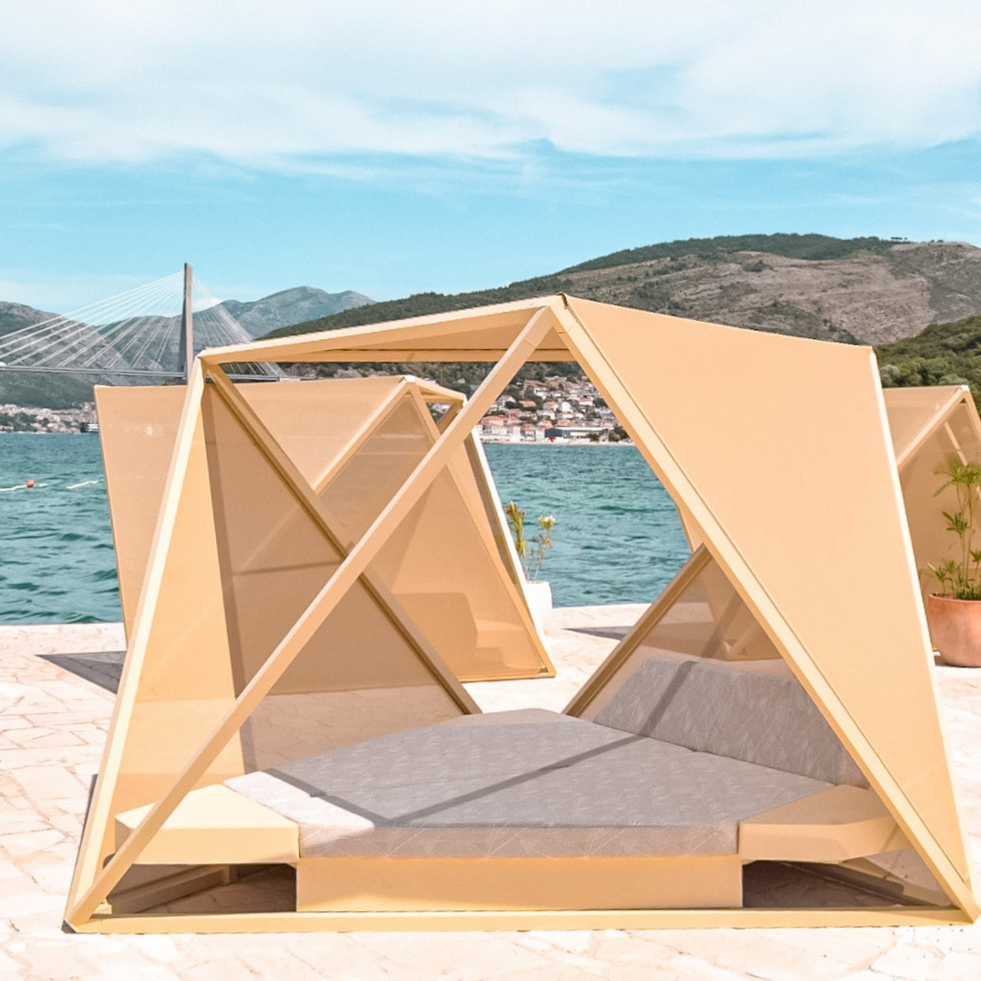 Our exclusive Seclude by FJAKKA daybed combines privacy, design, and comfort. Inspired by Mediterranean architecture and colors, this geometric modern gazeboo provides both shade and an immersive connection with the seaside atmosphere. Ideal for up to 4 persons who appreciate a serene and stylish retreat.